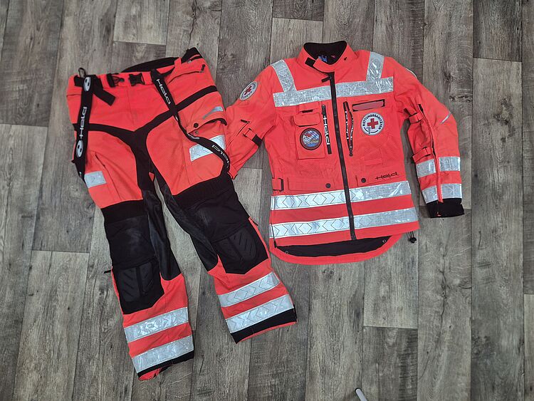 Held II Motorradschutzanzug in der speziellen Rettungsdienstausführung (Jacke und Hose) in leuchtorange mit Reflexstreifen.